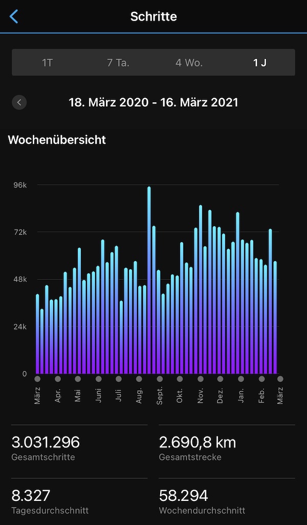 Trotzdem habe ich dann begonnen, den Werten meiner Sportuhr mal Beachtung zu schenken. Und war schon ein wenig entsetzt. An durchschnittlichen Bürotagen kam ich kaum über 4000 Schritte. Dabei hatte ich Aufzüge längst aus meinem Leben verbannt und auch den knappen halben Kilometer ins Büro legte ich natürlich zu Fuß zurück. Als ich dann vermehrt im Homeoffice war, wurden schnell aus den 4000 Schritten nur noch 1500. Ohne Lauftraining wäre ich niemals auf eine vernünftige Anzahl an Schritten gekommen.